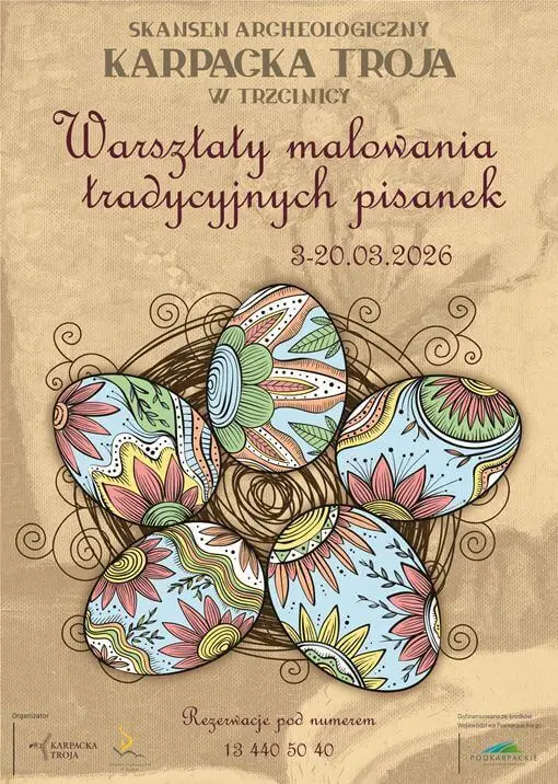 Jajko jest symbolem obecnym w wielu kulturach, a tradycja malowania jajek sięga starożytności. Również dla Słowian miało ono szczególne znaczenie – jako symbol odnawiającego się życia i narodzin. Najstarsze polskie pisanki pochodzą z grodu piastowskiego z X w. z opolskiego Ostrówka. W nawiązaniu do tej starej tradycji zapraszamy Państwa do Skansenu Archeologicznego Karpacka Troja w Trzcinicy na warsztaty malowania tradycyjnych pisanek. W trakcie zajęć uczestnicy będą mogli ozdobić drewniane jajko według wskazówek doświadczonego twórcę. Pisanka będzie doskonałą pamiątką ze skansenu, a każdy uczestnik będzie mógł zabrać ją ze sobą.